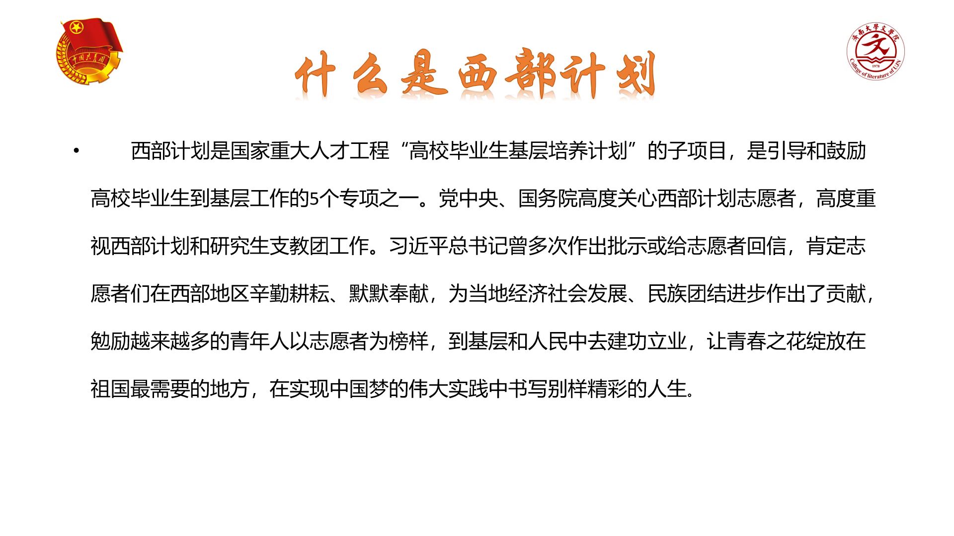 本科生、研究生对“西部计划”有了更深层次认识,为部分有志于投身西部建设事业的同学提供了渠道。下一步,学院将进一步加强对“西部计划”的宣传力度,全力完善各项体制机制,秉持“为党育人、为国育才”的理念,力争让更多文院学子了解西部计划,为有志于参与西部建设的同学进一步做好服务,保驾护航。