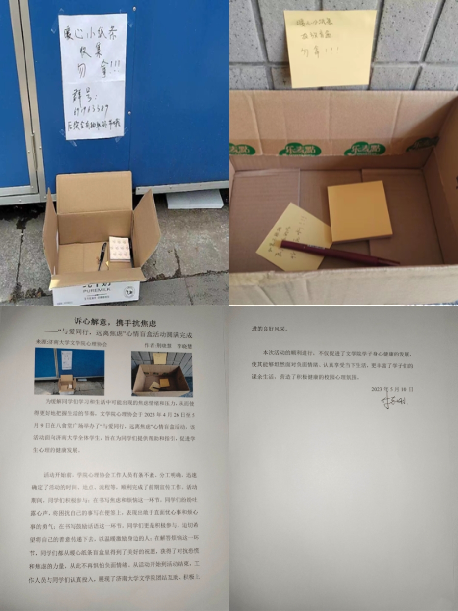 心理协会于2023年4月26日至5月20日在八食堂广场举办了“与爱同行,远离焦虑”心情盲盒活动,该活动面向济南大学全体学生,旨在为同学们提供帮助和指引,促进学生心理的健康发展。