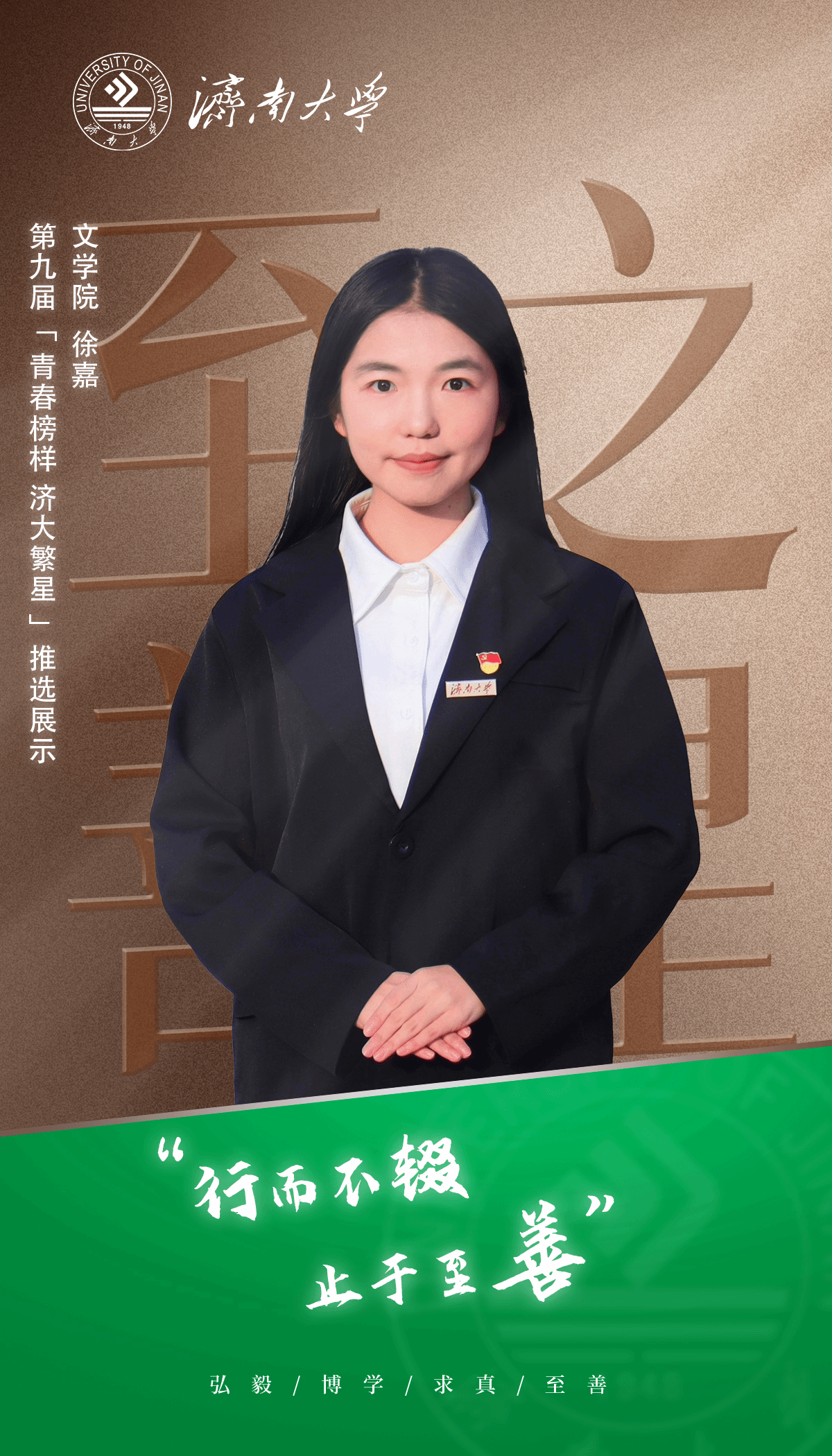 躬行至善,微光成炬。勤学之余,徐嘉始终秉持着“奉献、友爱、互助、进步”的志愿服务精神深耕实践沃土,带领团队在10余个基地开展志愿服务40余次,开展传统文化教育、读书分享等多元服务活动。她还多次组织承办“童伴小屋”流动儿童帮扶等大型志愿服务活动,以实际行动诠释对“至善”精神的深刻认识。在丰富的一线经验基础上,她主动求“新”,积极推进志愿服务常态化、品牌化建设,目前已形成5个常态化支教项目。此外,她注重成果转化,积极参与志愿服务赛事。2025年暑假,她带队开展“三下乡”实践活动,走进田间地头,深度考察乡村振兴的蝶变故事,见证一代代乡村奋斗者的初心。她和团队的服务事迹被多个国家级、省级媒体报道,团队获得济南大学“三下乡”社会实践的多项主要荣誉。