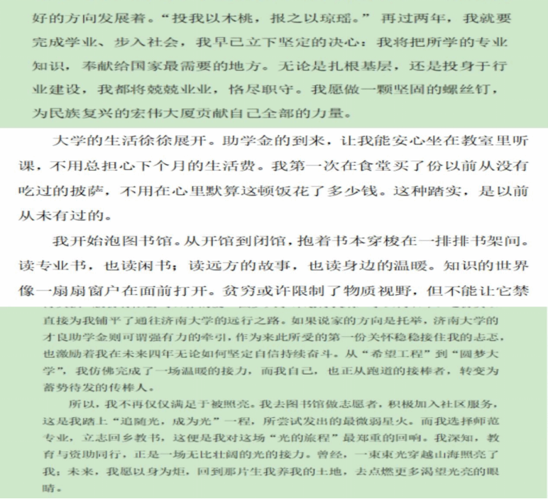 在参赛作品中,同学们紧密围绕主题,从不同角度、不同层面分享了自己在国家资助政策关怀下的成长故事。有的同学激动地说到是才良奖助学金为他铺平了在济南大学的逐梦之路;有的同学讲述了助学金如何帮助自己缓解经济压力,让自己能够全身心地投入学习;有的同学表达了对老师、学校和社会的感激之情,立志努力学习专业知识,以优异的成绩回报社会;还有的同学描绘了在资助政策支持下,克服困难、追逐航海梦想的坚定决心,字里行间饱含着真挚的情感,展现出航海学子积极向上、自强不息的精神风貌。