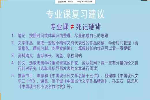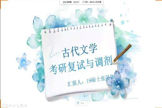 学办主任李筱楠老师首先做了动员讲话,随后张晏铷、边文婕、陈瑾结合自身考研经历,着重向同学们介绍了考研复试与调剂的相关信息,主要包括调剂系统使用的注意事项,复试相关问题与技巧,并向同学们强调了不到最后一刻绝不放弃,坚定信念的重要性。陈欣欣、刘欣、颜敏、单礼洋结合自身专业,分别从专业课学习、公共课学习方面分享了自己的考研复习时间轴,学习资料的选择,心态调整等方面的心得。高环宇向大家简述了她考研二战时的经历经验;学科教学(语文)专业主讲韩雨晓、文艺学专业赵小燕强调了专业院校选择方面的注意事项;刘馨琳特别分享了古代文学作品后的历史背景对知识理解的重要性;管姣姣强调考研不要只要重视战线的排布,效率也同样重要,狠抓效率往往起到事半功倍的作用;谭玥则特别从英语学习的角度与大家分享方法。各位分享者都由衷鼓励大家坚定考研信念,不忘初心,并相信大家只要选择正确方法、一直砥砺前行定能考取自己的心仪院校。