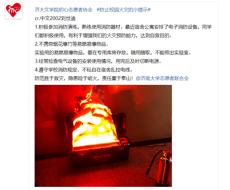 初心志愿者协会敬老服务队组织开展了为期一周的消防周征稿活动,此次活动于线上开展,学生参与度高,进展顺利。