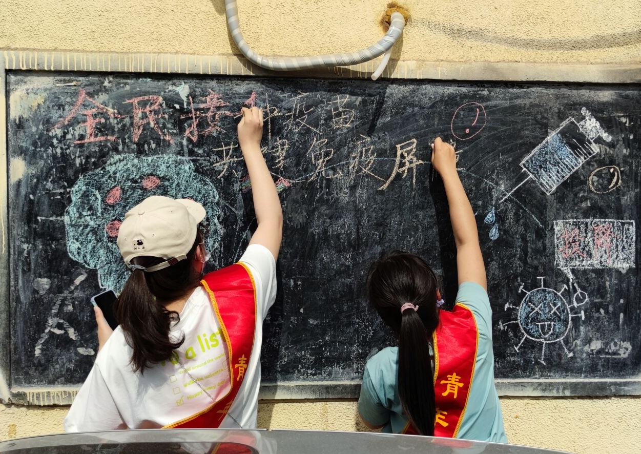 活动初期,志愿者们经过多番讨论,确定以疫苗推广为活动主题,并且积极了解疫情防控现状以及疫苗推广情况。充分了解当下疫情防控工作情况后,志愿者们制定了活动方案并梳理了活动流程。5月11日下午,志愿者们到达王官庄小区,开始进行疫苗推广黑板报活动。活动过程中志愿者们积极配合、相互帮助、秩序井然,不但详细地用文字介绍疫苗接种的相关内容,而且通过生动有趣的图画来给民众强调疫苗接种的重要性。活动结束后,志愿者们对此次活动进行了深刻总结,为日后工作地进一步完善做准备。