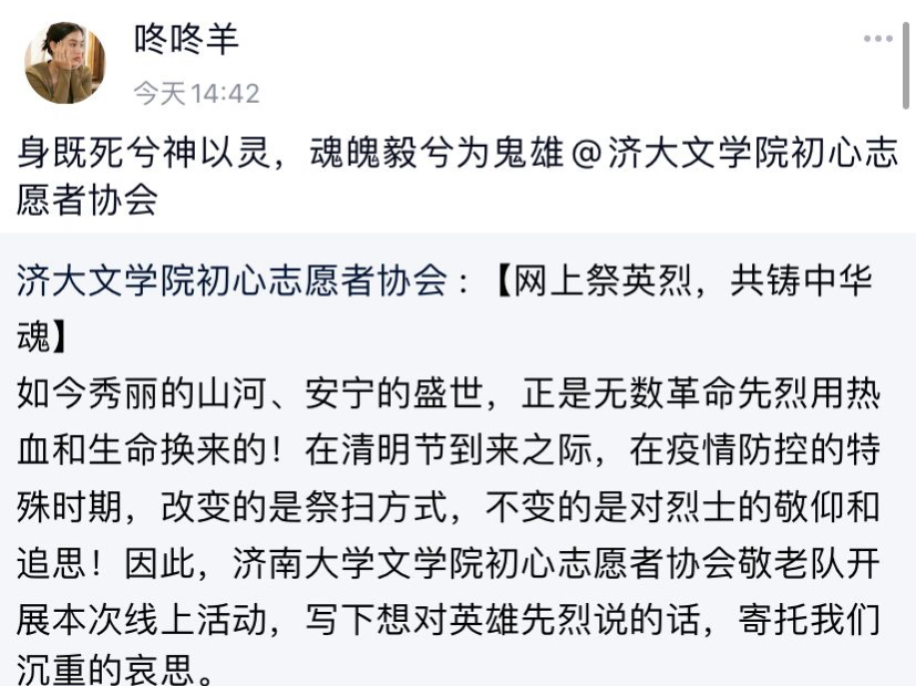 活动前期,我院志愿者协会工作人员充分考虑清明节时期的节日特征,结合疫情当下学生们的心理活动,确定了活动主题,并广泛宣传。活动过程中,同学们积极参与,通过在QQ空间发表动态的方式缅怀先烈,讲述先烈的伟人事迹,用文字传达了怀念与哀思。本次活动积极跟进,前期宣传收获了广大同学的热情支持,讲述伟人事迹,用文字表达哀思,传承百善孝为先的中国优秀传统文化,在和平的年代不忘感谢为我们生存和发展做出巨大贡献的英雄们。