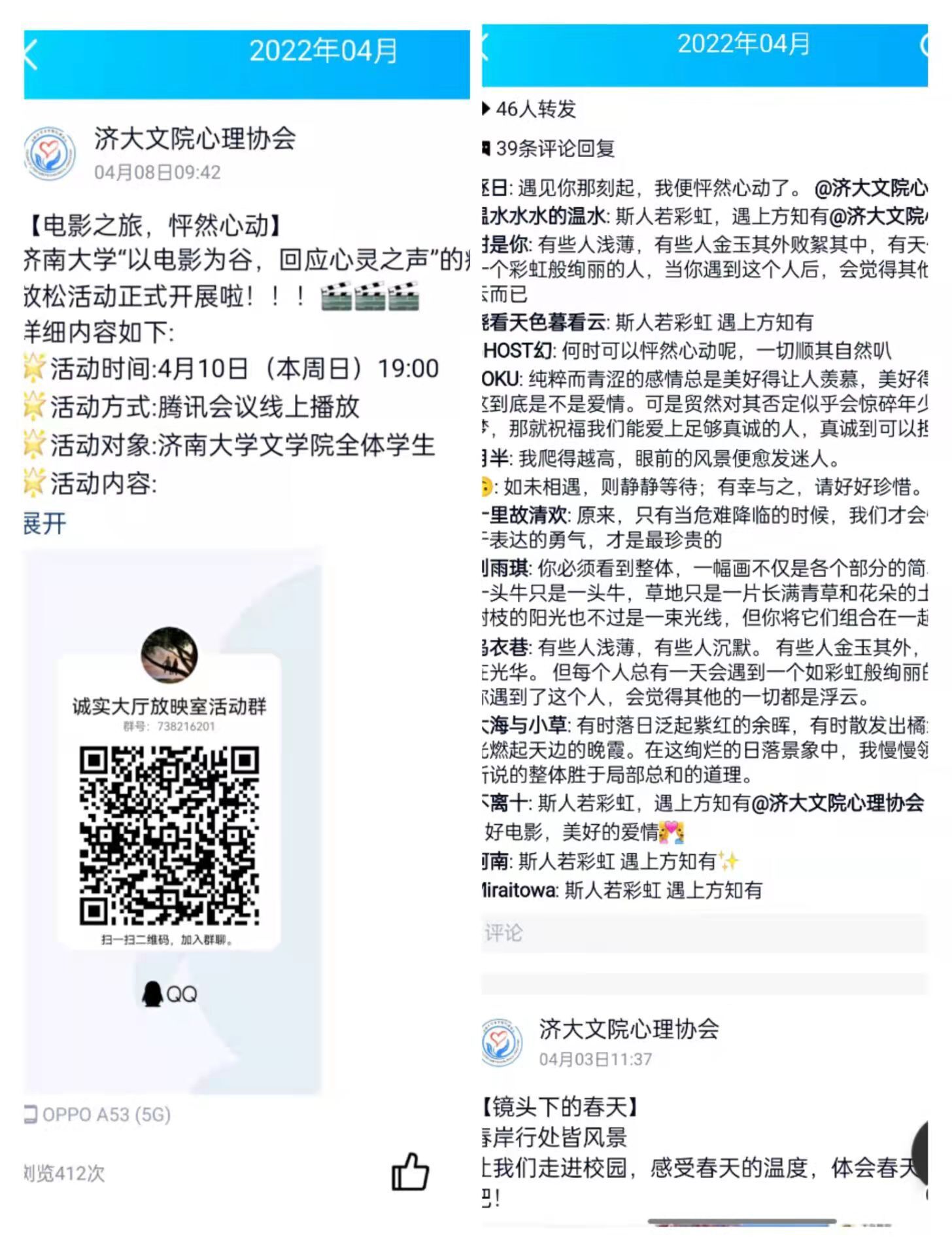心协号召和自身兴趣,积极发表触动感言和文字影评。在此次活动中他们不仅内心得到了放松,也获得了情感上的启迪。
