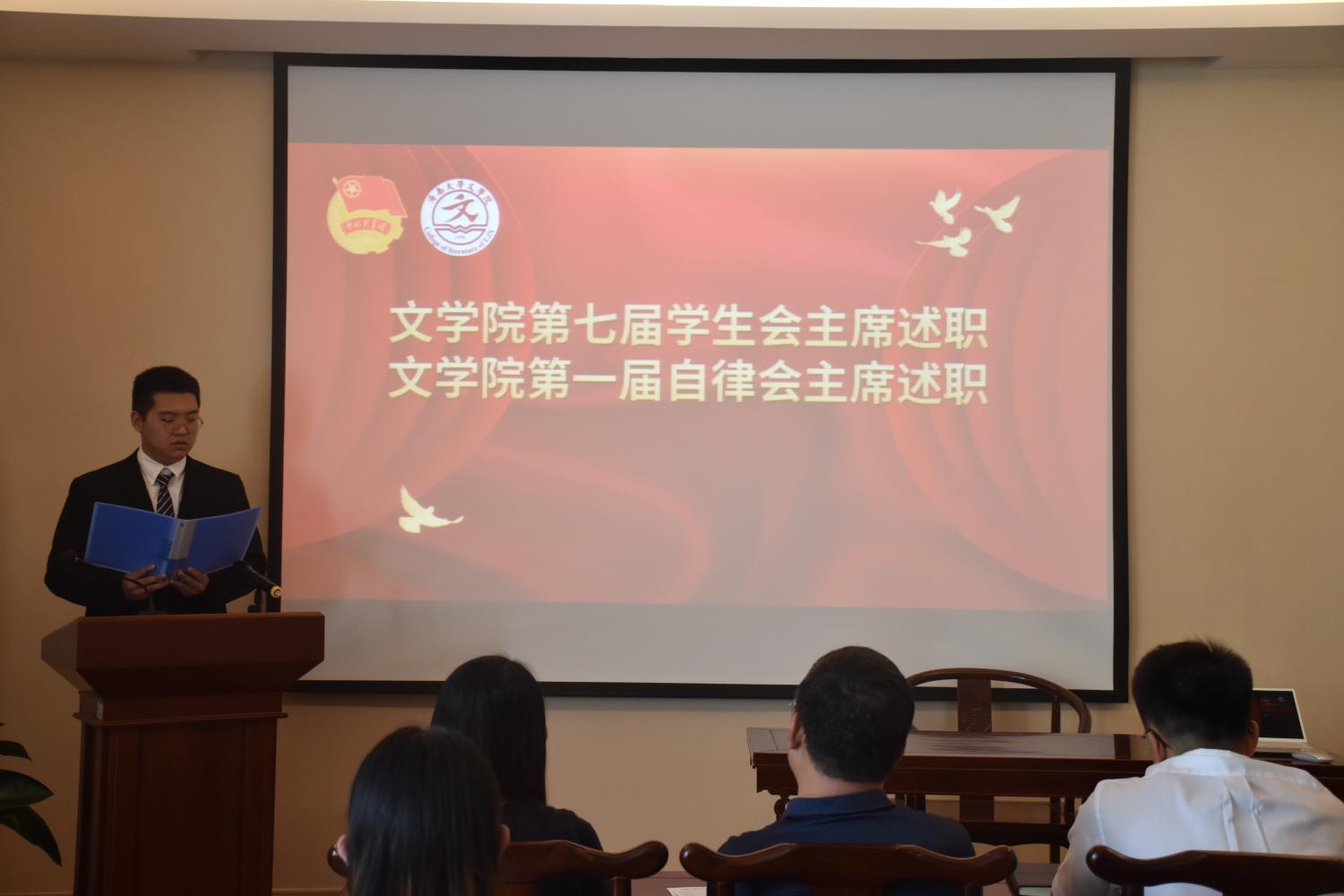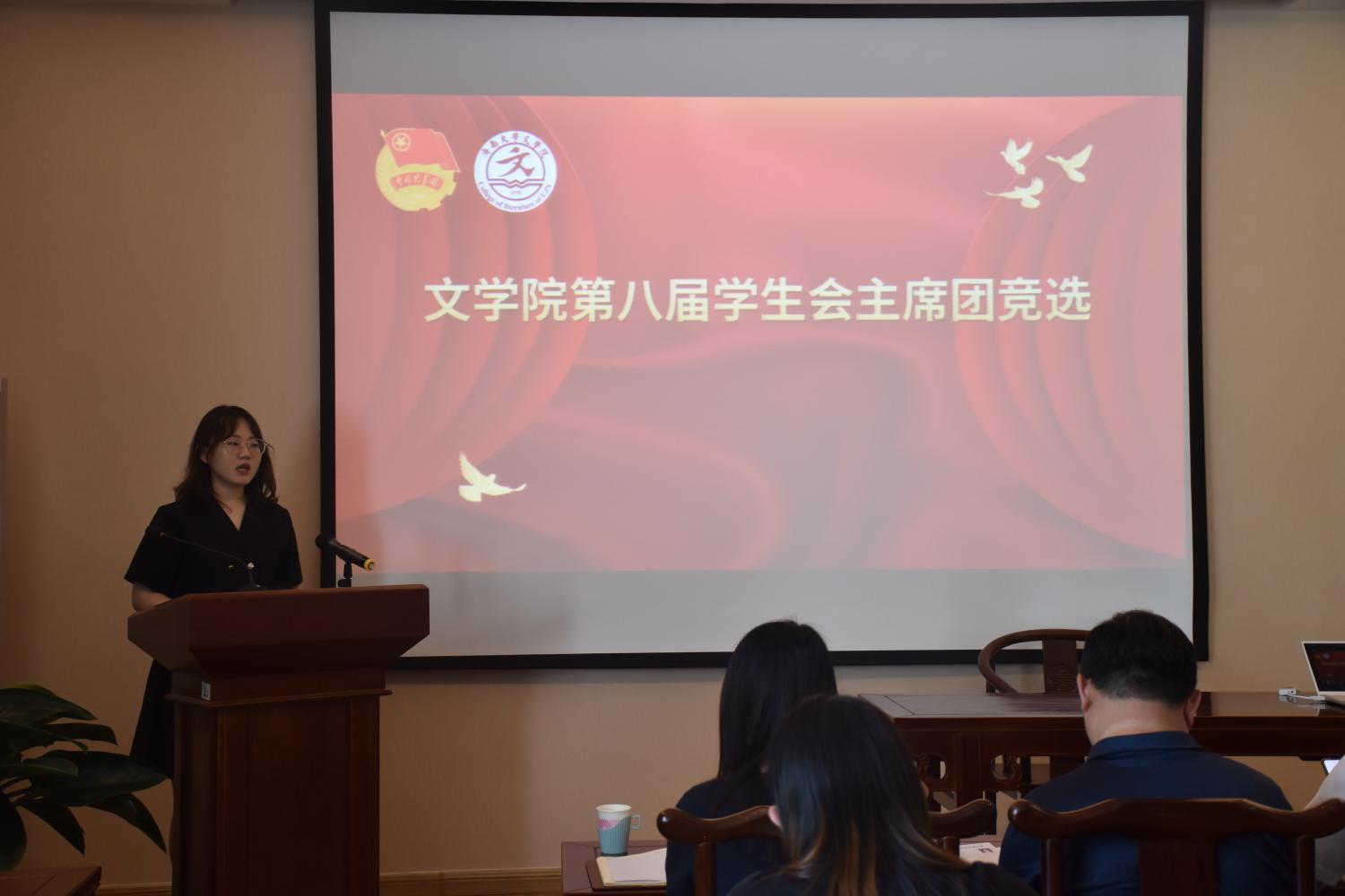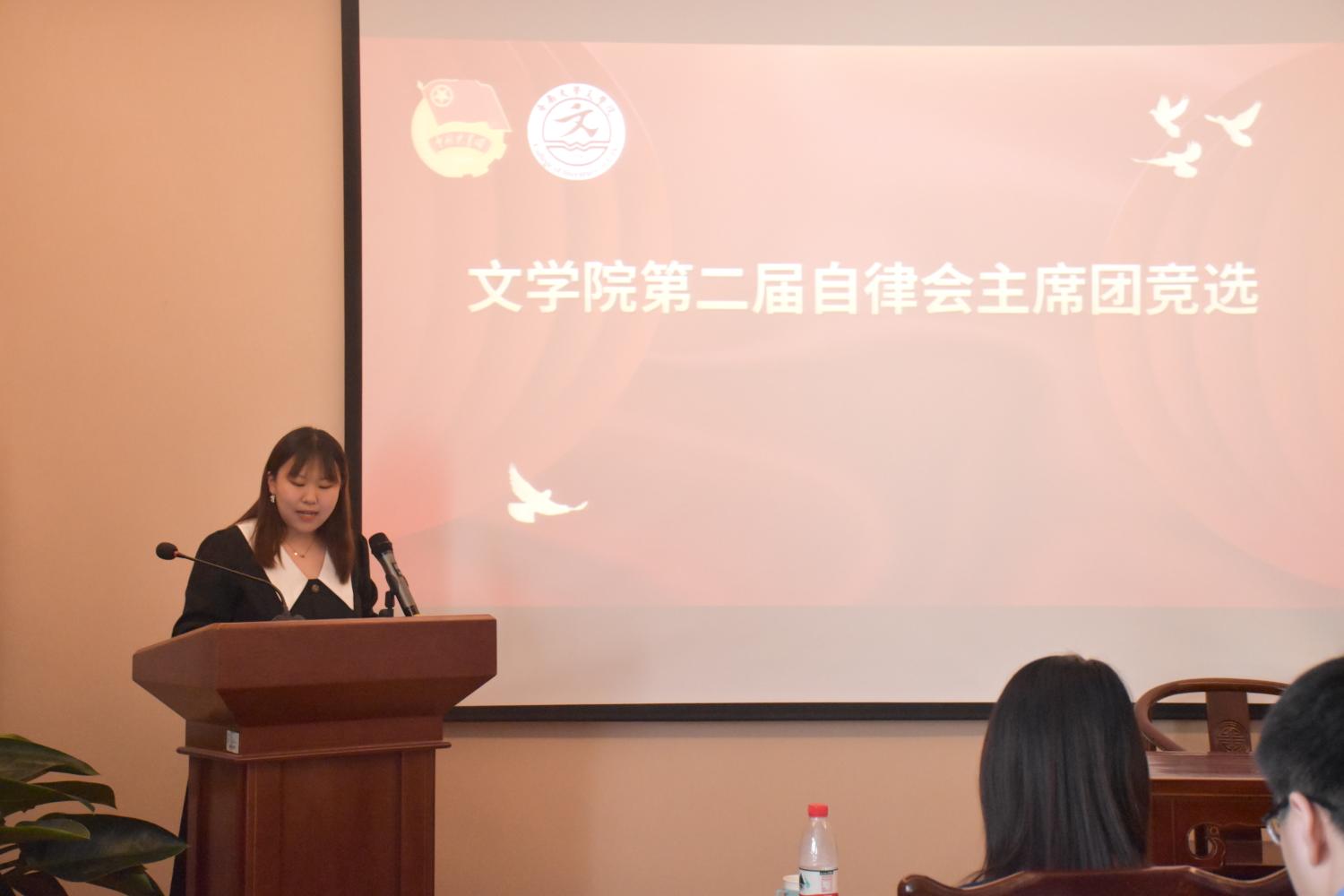 第八届学生会、第二届自律会主席团和各部门负责人。会上,竞选者依次上台发表演讲,他们情绪热烈、热情洋溢,纷纷阐明了自身的竞争优势,在竞选演讲中分享了自己的工作经验,表达自己对竞选岗位及工作的认识,阐述了竞选岗位的未来发展计划,并表明了自己的信心和决心:作为学生组织成员,要严于律己,严格遵守学校各项考核细则、起到模范带头作用,团结好老师,服务好同学,在服务他人的同时,也要不断提高自己的综合素养。评委团成员对竞选同学进行了现场点评和提问,并对其能力进行考察,现场气氛紧张而热烈。