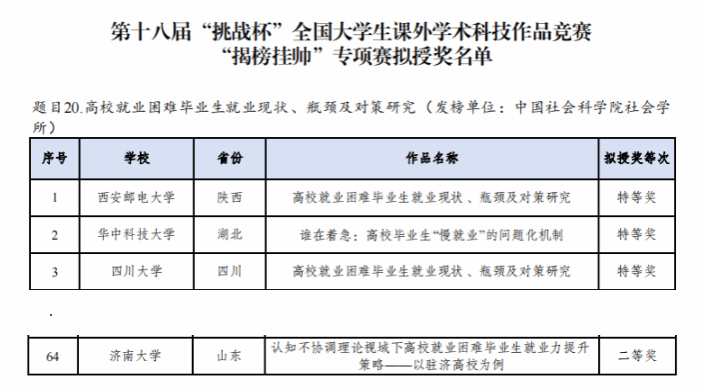 自挑战杯“揭榜挂帅”专项赛启动以来,在校团委的指导下,学院高度重视,从项目选题、实地调研、报告撰写等方面积极准备,组织专家评议。该揭榜题目为“高校就业困难毕业生就业现状、瓶颈及对策研究”由中国社会科学院社会学所发榜。参赛作品通过认知不协调理论分析高校就业困难毕业生的就业现状、瓶颈及对策研究。团队成员在驻济高校深入调研,广泛收集数据,通过对毕业生就业问题的深度分析,提出了一系列有针对性的解决方案。