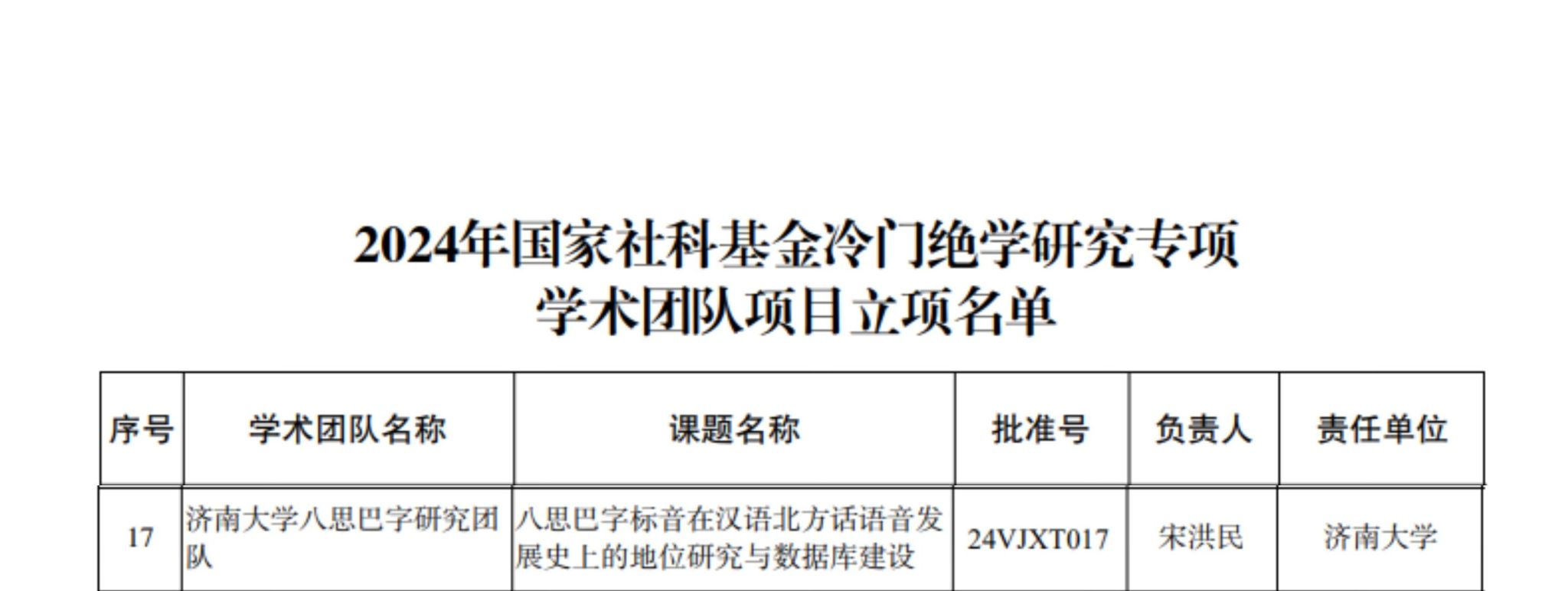宋洪民教授作为首席专家的“济南大学八思巴字研究团队”申报的《八思巴字标音在汉语北方话语音发展史上的地位研究与数据库建设》课题获批立项(项目编号24VJXT017),资助额度为80万元,这是我校在该类重大项目上的历史性突破,也是本年度山东省唯一获批的学术团队项目。