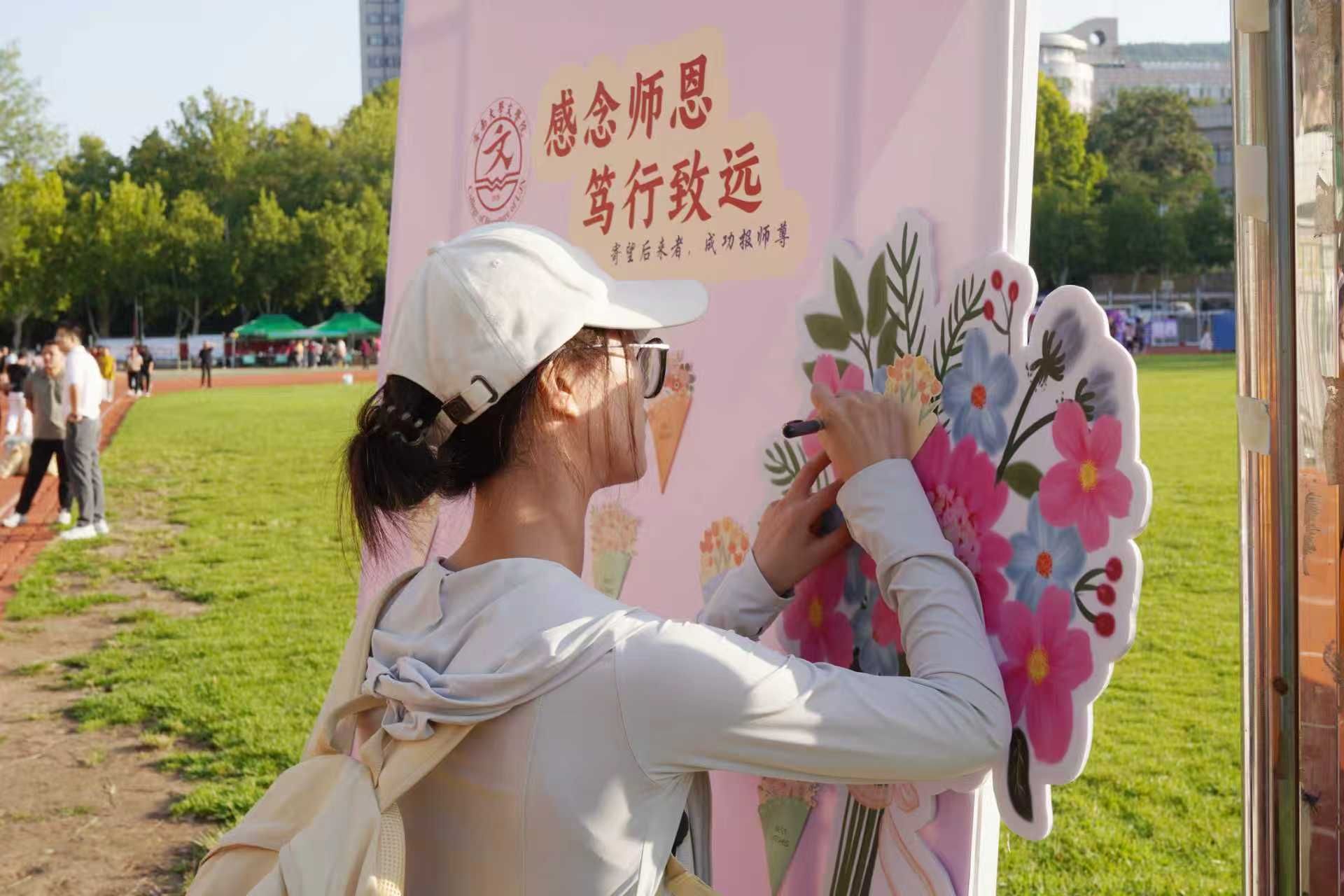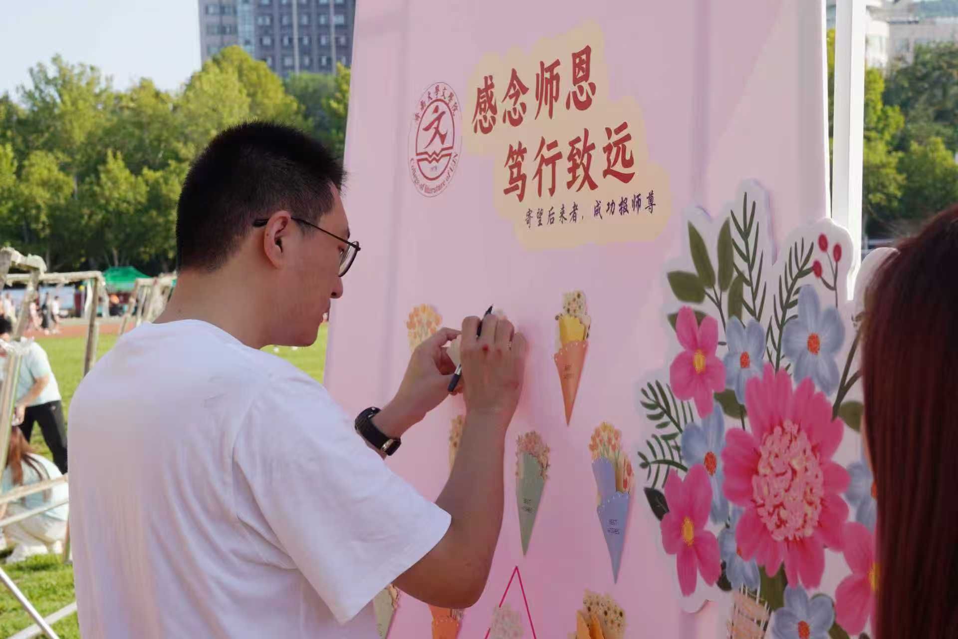 迎新日恰逢教师节,“感念师恩 笃行致远”主题展板前,新生们提笔写下教师节祝福,体味桃李无言,学会感念师恩,开启了他们的入学第一课。