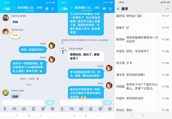 根据学校要求,每门课程都建立了课程微信群或者QQ群,保证师生联系畅通,及时传达发布各类教学通知、文件等。教务秘书提前汇总疫情期间授课方式及课代表信息,帮助各课授课老师和选课同学取得联系,督促学生按时参加线上授课,及时处理学生退补选期间出现的各种问题,保障教学秩序顺利开展。此外,学院专门成立线上教学保障团队、线上教学指导团队、线上教学督导团队,确保春季学期线上教学工作能够顺利进行。