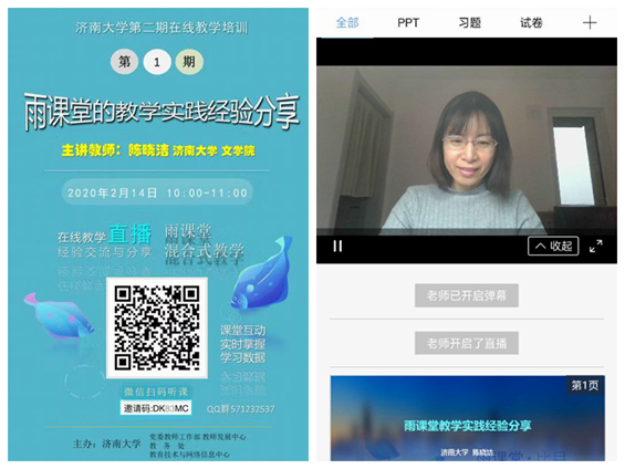另一方面,学院积极组织教师参加学校开设的网络授课培训,掌握济南大学网络教学平台、雨课堂等智慧教学软件的使用与操作方法。其中我院教师陈晓洁受学校教师发展中心的邀请,为全校教师作了“雨课堂的教学实践经验分享”的辅导。