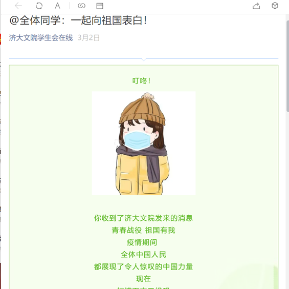 学子设计多张图文并茂的线上海报,其中引用了习近平总书记对青年人的讲话,呼吁青年们爱国先行、肩负责任。此次活动得到文院青年的积极反馈,推文的浏览量和访问人数达到新高,同学们受到启发和鼓舞,纷纷在留言区内留下对祖国的真挚的赞颂和祝福,并转发关于“济大文院人表白祖国”的H5。