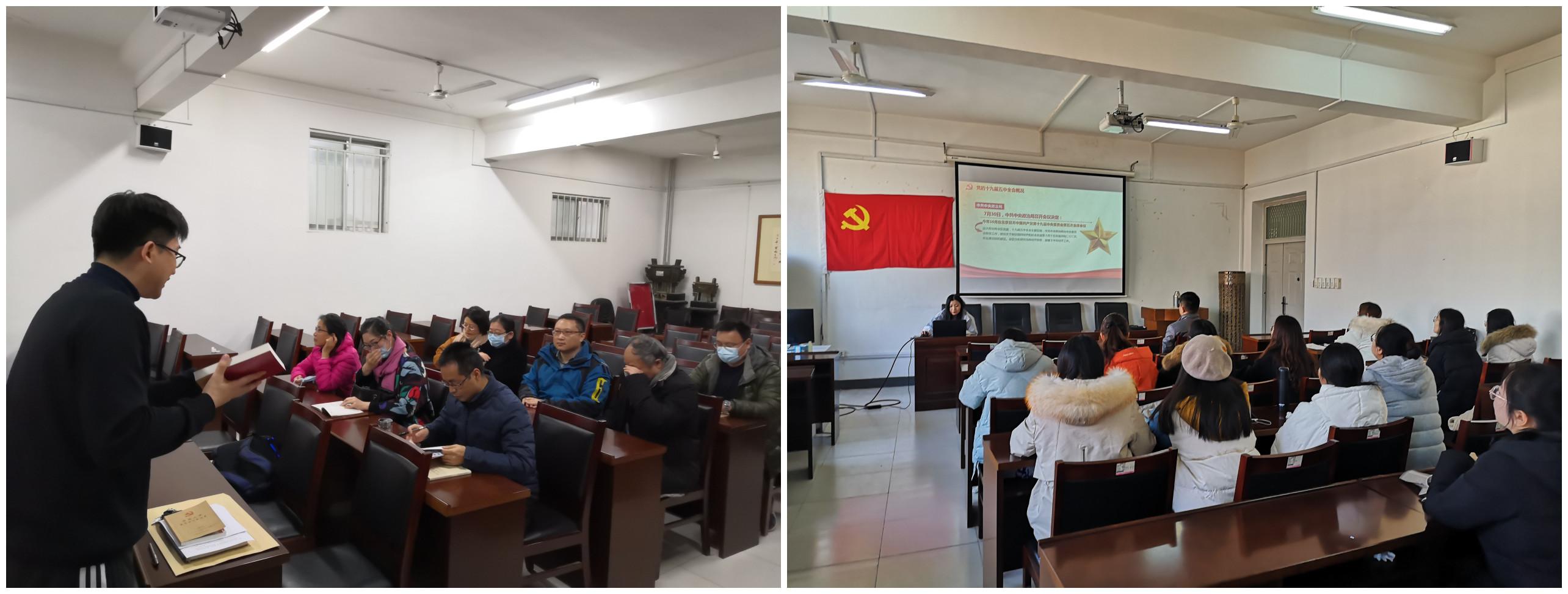 教工中文党支部支部书记唐欣从“一个核心地位、三个‘首次’、一个重大判断”三个方面,对党的十九届五中全会精神进行了详细解读。教工传播党支部共同学习了《党的十九届五中全会<建议>学习辅导百问》。学生中文党支部、学生传播党支部、研究生党支部学习了《中国共产党第十九届中央委员会第五次全体会议公报》、《党的十九届五中全会<建议>学习辅导百问》,结合学生实际情况对全会的十个新提法和十个新理念新思想新战略进行了系统的学习和领会。