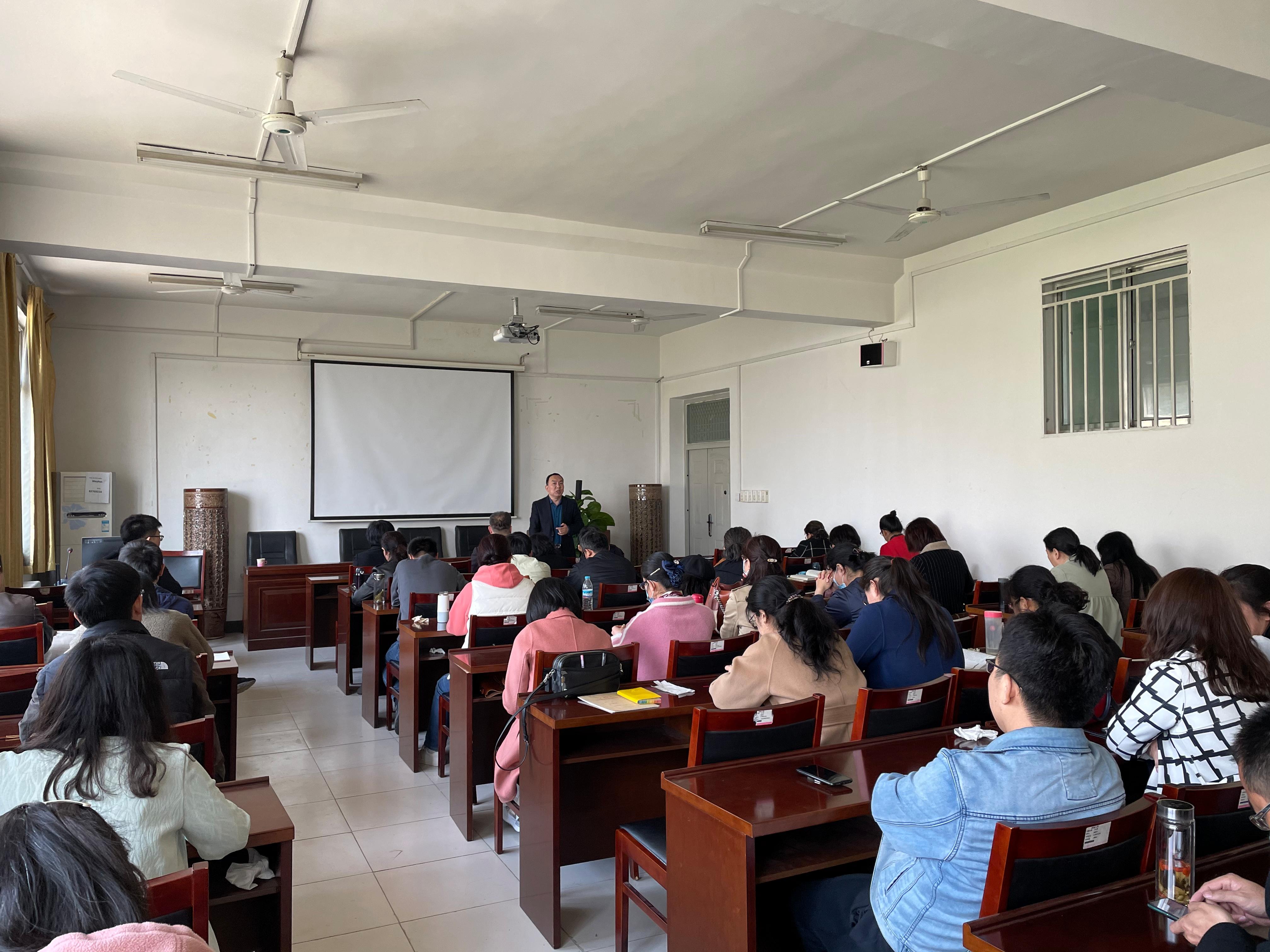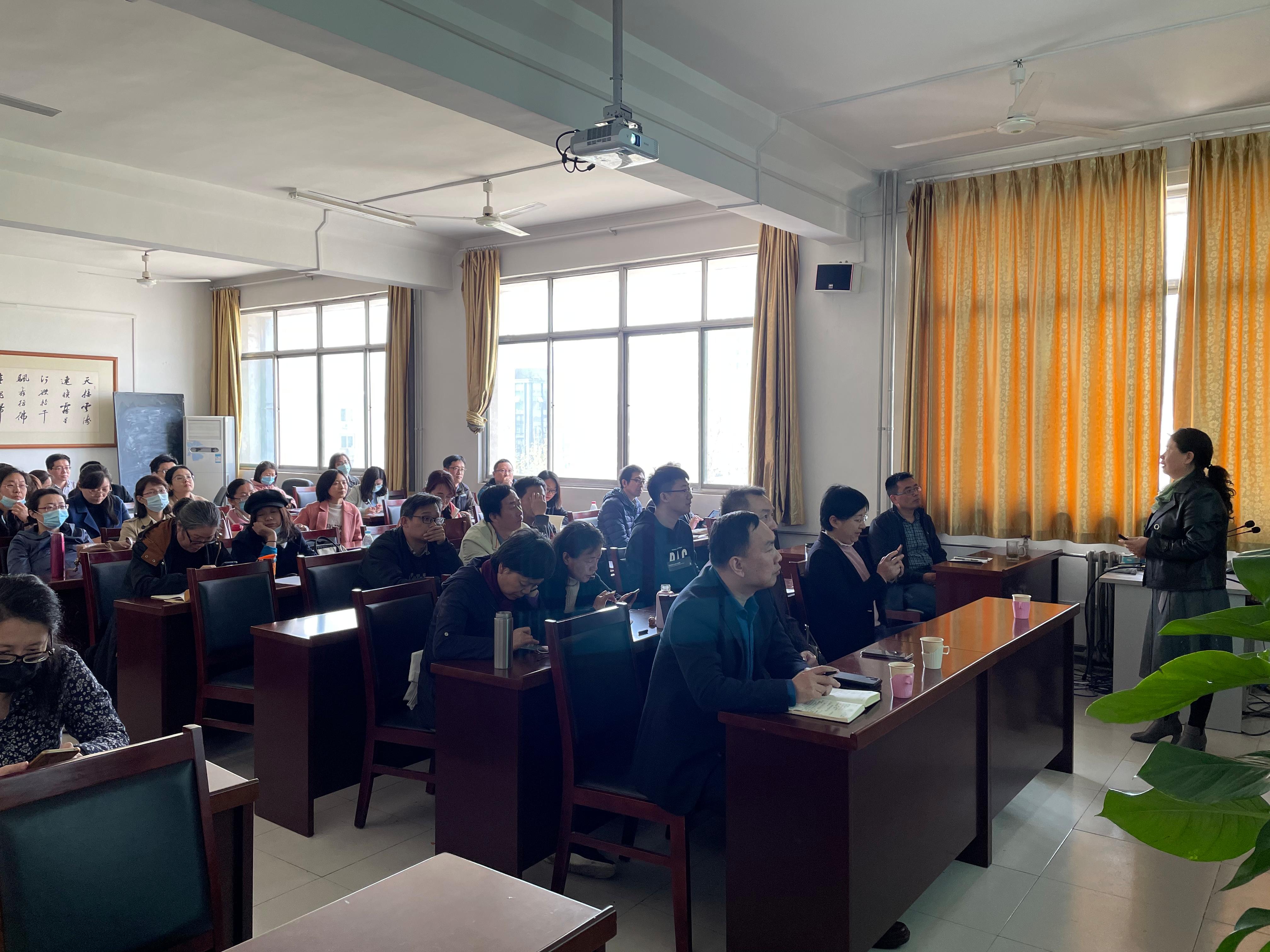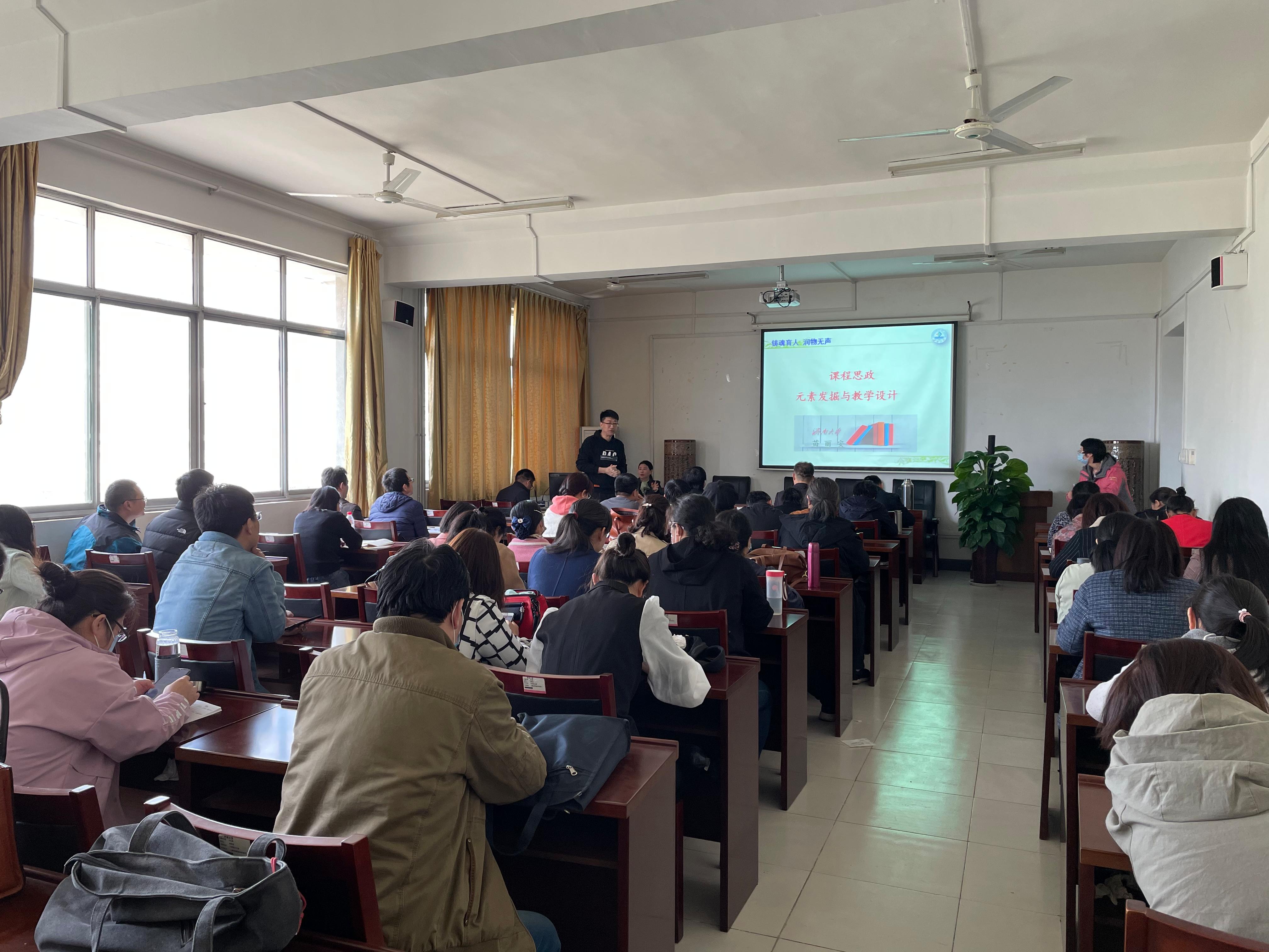 随后,苗立安教授向全体教师作了题为《课程思政元素发掘与教学设计》的报告,从课程思政的内涵与目标、课程思政的建设与策略、思政元素的发掘与实践、教学方案的设计与评价等四个部分对课程思政建设进行了详细讲解。苗教授指出,深度挖掘各学科课程蕴含的思政教育资源,解决各类课程与思政课的相互配合问题,使各类课程与思政课同向同行,是课程思政建设的中心任务。同时,苗教师例举了大量生动恰切的教学案例阐释课程思政的具体实施与评价。