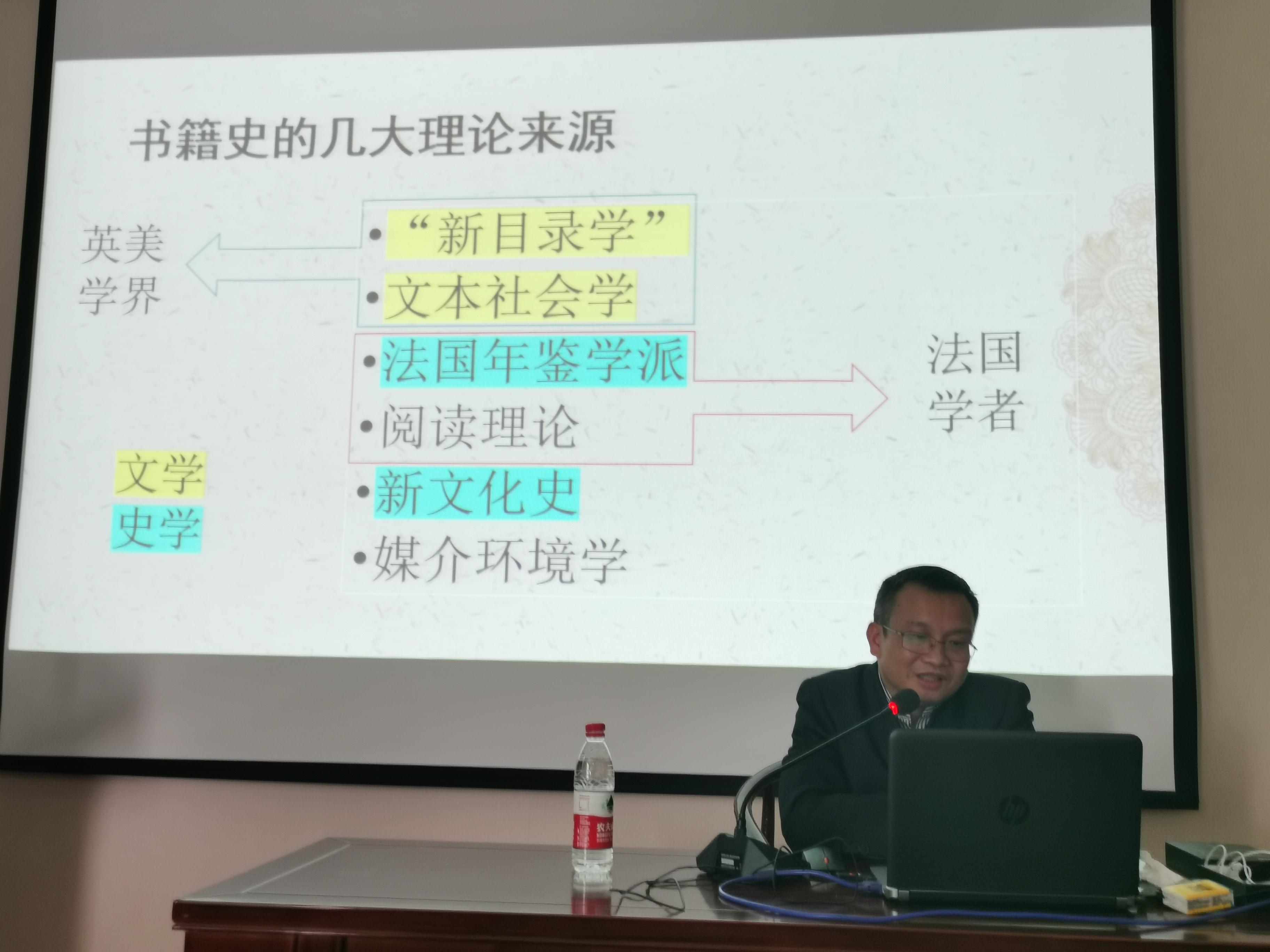 何朝晖教授从书籍史是什么、书籍史的理论、书籍史的方法以及论著举例四个方面展开,认为书籍史是近三四十年来兴起的新兴交叉学科,“书籍史”应包括文献学的角度、图书馆学的角度、传播学的角度、文学的角度等,以往的书籍研究大多专注于物质和技术层面,很少分析书籍文化,以及书籍对社会文化环境的影响;书籍史的理论,源自英美学界的“新目录学”和文本社会学、法国年鉴学派、阅读理论、新文化史和媒介环境学等,书籍史的旨趣在于跳出书籍看书籍,透过书籍看历史;关于书籍史的研究方法,除了文献学、历史学、文本研究等方法外,还要借鉴社会学、传播学等领域的研究方法;在论著举例方面,推荐几本重要著作,如《谋利而印:11至17世纪福建建阳的商业出版者》《近代中国早期的出版、文化与权力》《万卷:黄庭坚和北宋晚期诗学中的阅读与写作》等。