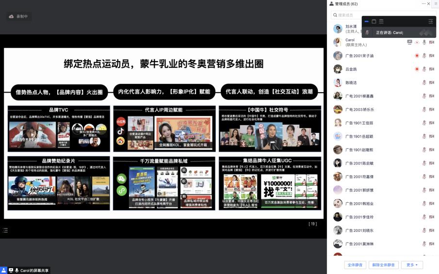 首先,范小玲女士向同学们分享了其大广赛获奖作品《再见火锅》的创作经历,向同学们讲述了其作品的产出路径为“大胆假设、小心求证、不断学习”三部分,鼓励大家不断创新、认真洞悉市场发展趋势与消费者心理,不断从理论与案例中进行学习,与时俱进,提升自我。接着,范小玲女士从自身经历出发,向大家分享了实习面试与正式工作面试的经验,鼓励同学积极参与社会实践,提高自身能力,为未来就业积累社会经验。在分享会的第三部分,结合“平台共创”“KOL市场及其相关产业/产品”“绑定热点运动员,蒙牛乳业的冬奥营销多维出圈”“解释传统节气时令,饿了么孵化时令场景营销IP”等新兴热点与营销案例,范小玲女士向大家介绍了广告行业发展趋势与就业前景,令同学们对广告行业有了更深一步的了解。在交流环节,同学们热情高涨,针对未来的发展方向、实习获得途径、广告公司的工作内容、大学期间应该培养的能力等方面提出自己的疑惑,范小玲女士一一为同学们进行了解答。陈晓洁老师、刘水清老师、徐利老师也积极参与讨论之中,与同学们进行交流分享。