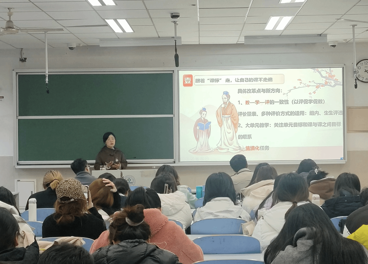 11月18日下午、11月22日下午,分别邀请第十二届山东省师范类高校学生从业技能大赛高中组一等奖获得者刘骏成和初中组一等奖获得者王文泉进行了备赛经验分享。在教育见习期间,学生自行结合成小组,进行了教学展示,见习指导老师从教姿教态、教学设计、文本分析、作业布置、板书设计等方面进行了点评。