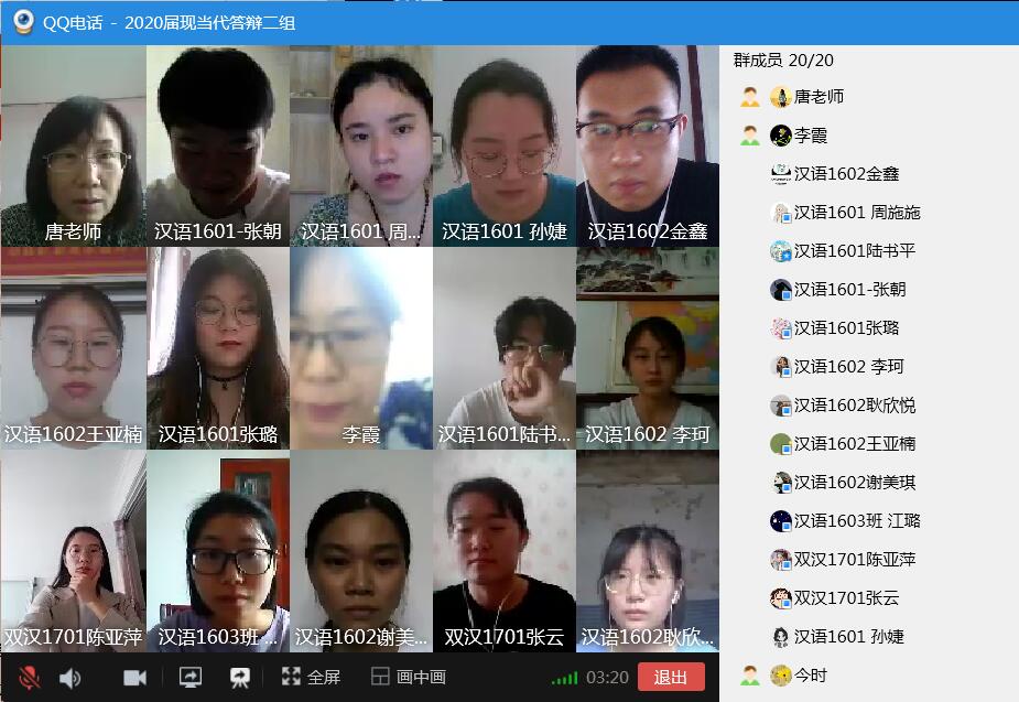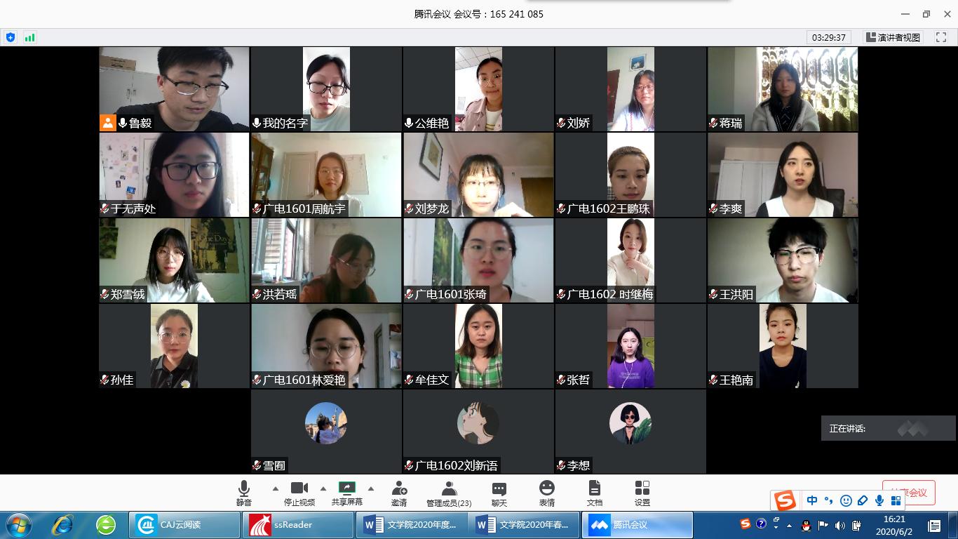 2020年6月2日下午13点,足球预测app 2020届本科毕业生论文第一次答辩顺利进行。因为疫情原因,本次答辩工作采用线上进行的方式,共分为汉语言文学、汉语国际教育、新闻传播学3个大组,其中汉语言文学大组下设现当代文学、文艺学、写作学、古代文学、汉语、外国文学等11个小组,汉语国际教育下设4个小组,新闻传播学下设广播电视学、广告学、编辑出版学等7个小组。本次答辩共有385名学生参加,68名教师参与答辩工作。经过第一次答辩,共有375名学生顺利通过答辩,24人获评校级优秀论文。