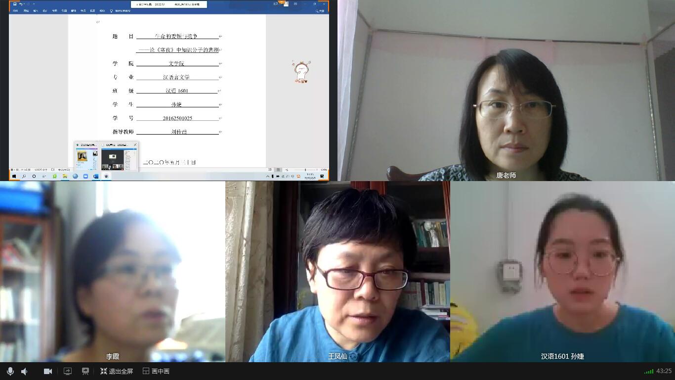 2020年6月9日下午13点,足球预测app 2020届本科毕业生第二次答辩顺利举行。第二次答辩依然采用线上答辩,共分为汉语言文学、新闻传播学两组,共有10名学生参加,7名教师参与答辩工作。经过第二次答辩,10名学生顺利通过。