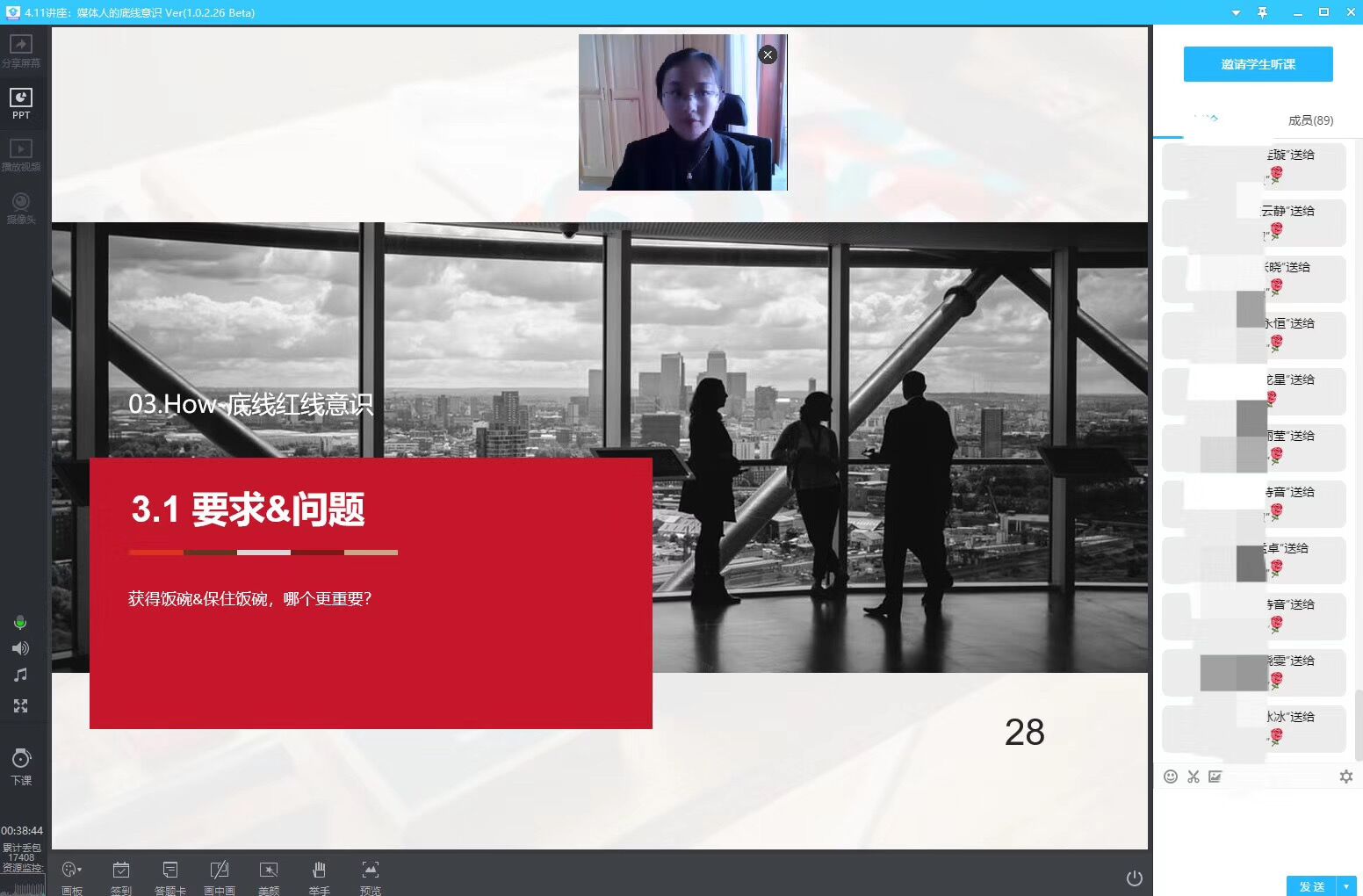胡顺淑老师从新闻伦理案例、制片审核方向、底线红线意识三个方面展开,延展至当前行业的要求,并对广电学子做出发展提出建议。首先,以《饥饿的苏丹》、《搜索》等新闻行业著名争议事件作为题引,再讲述疫情期间女记者不适当采访钟南山院士的热点事件,阐释媒体人的职业担当和新闻素养;由此提出“新闻的人文关怀”。紧接着,对互联网流量时代“人人都是麦克风”、“注意力就是经济”提出见解,就自媒体的运营现状进行概括性总结,以“咪蒙”等公众号的兴衰讲解“获得饭碗和保住饭碗”的孰轻孰重,形象的解释底线意识和红线标准的新闻原则。胡顺淑老师从制片和监测中的九大节目种类为引提出了符合社会主义核心价值观的总体要求,并就新闻类、综艺类、情感调解类、涉法涉案类、未成年人参与类、少儿类、谈话访谈类、生活服务和资讯类、科教类等电视节目进行解读,提出“线上线下一个标准”这一观点。