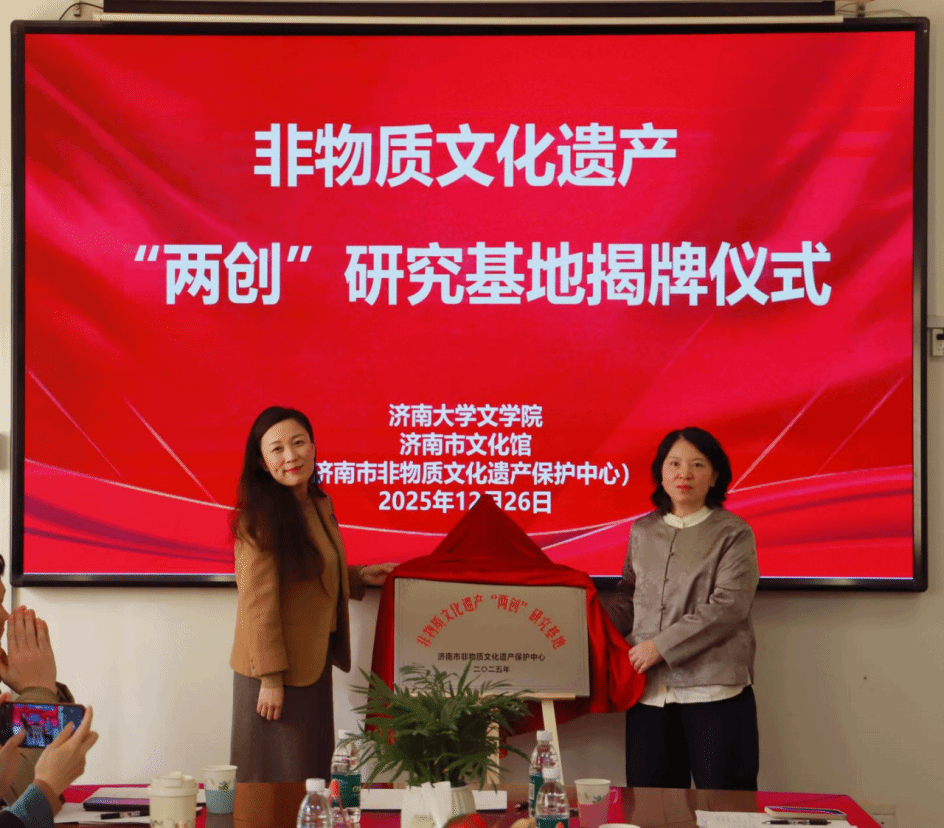 院长助理王恩旭与济南市文化馆副馆长付伟安签署共建协议;范丽敏院长与张琳馆长共同为“济南市非遗‘两创’研究基地”揭牌,标志着该平台正式启动。