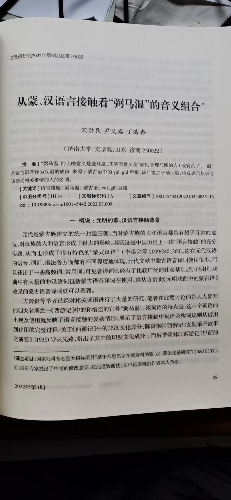 我院汉语言文字学学科方向带头人宋洪民教授,在《古汉语研究》(CSSCI)2022年第3期(总第136期)发表学术论文,《从蒙、汉语言接触看“弼马温”的音义组合》,本课题为宋教授主持的国家社科基金重大招标项目“基于八思巴字文献资料的蒙、汉、藏语接触研究”(项目编号:20&ZD303)阶段性成果。
