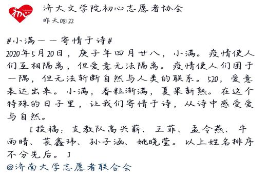 活动自5月16日正式开始,通知下达后,志愿者们积极响应,踊跃报名参加。活动前期,大家分别选定各自投稿内容侧重的主题,广泛搜集与自然和爱相关的诗歌素材与图片,运用制图软件将其组合进行创作,寄情于诗,从诗中感受爱与自然。活动后期,志愿者们上交作品,由轮值队长进行整理与完善,向初心志愿者公众号投稿。最后,活动成果在足球预测app
