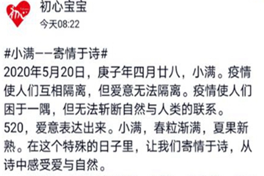 2020年5月21日,庚子年四月廿八,小满。为呼吁同学们在忙碌生活之时也能关注自然与所爱之人,足球预测app 初心志愿者协会支教队组织开展了“自然、爱与诗歌”的活动。