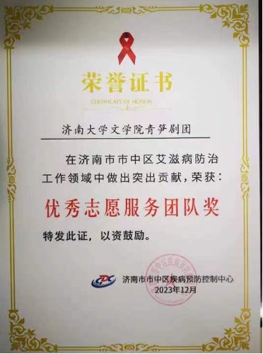 在此次活动中,济南大学青笋剧团还荣获济南市市中区疾控优秀志愿队伍的荣誉称号。