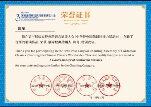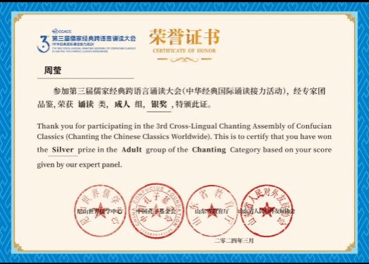 第三届儒家经典跨语言诵读大会荣获“银奖”