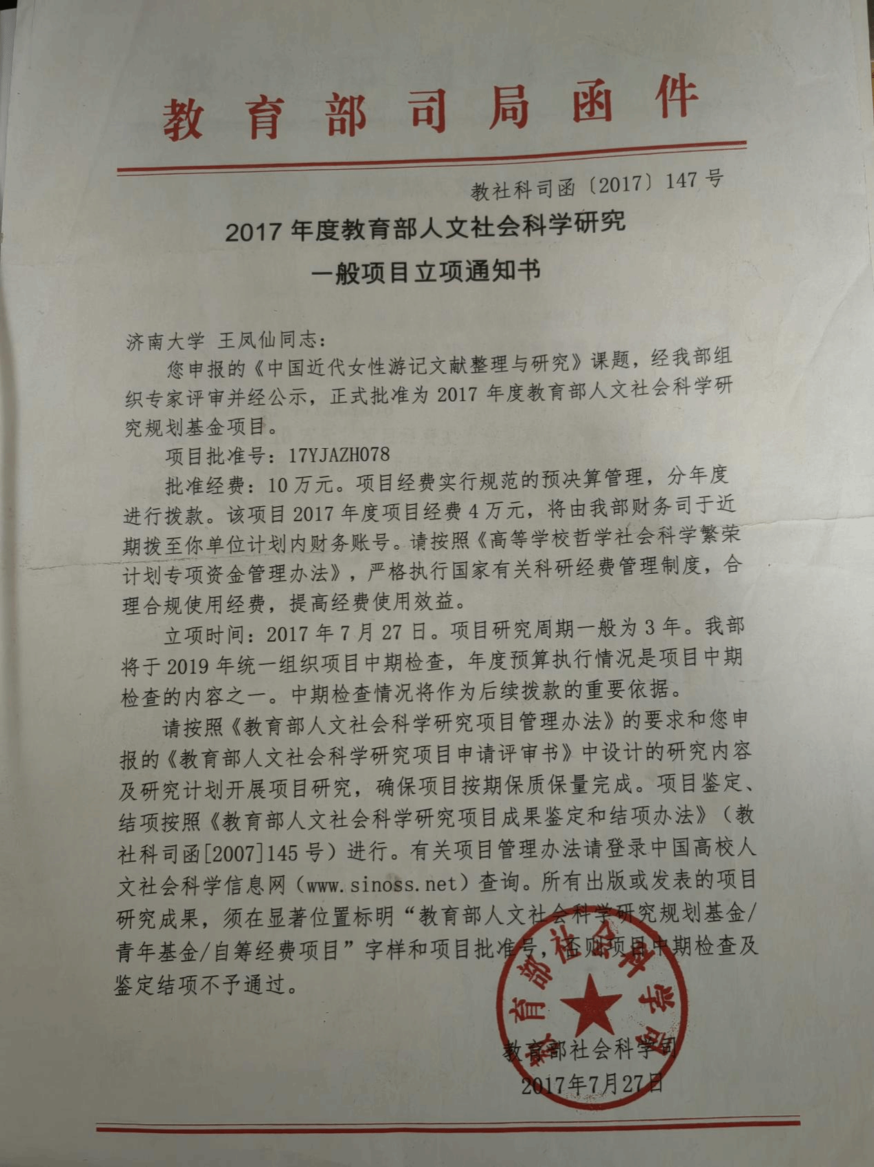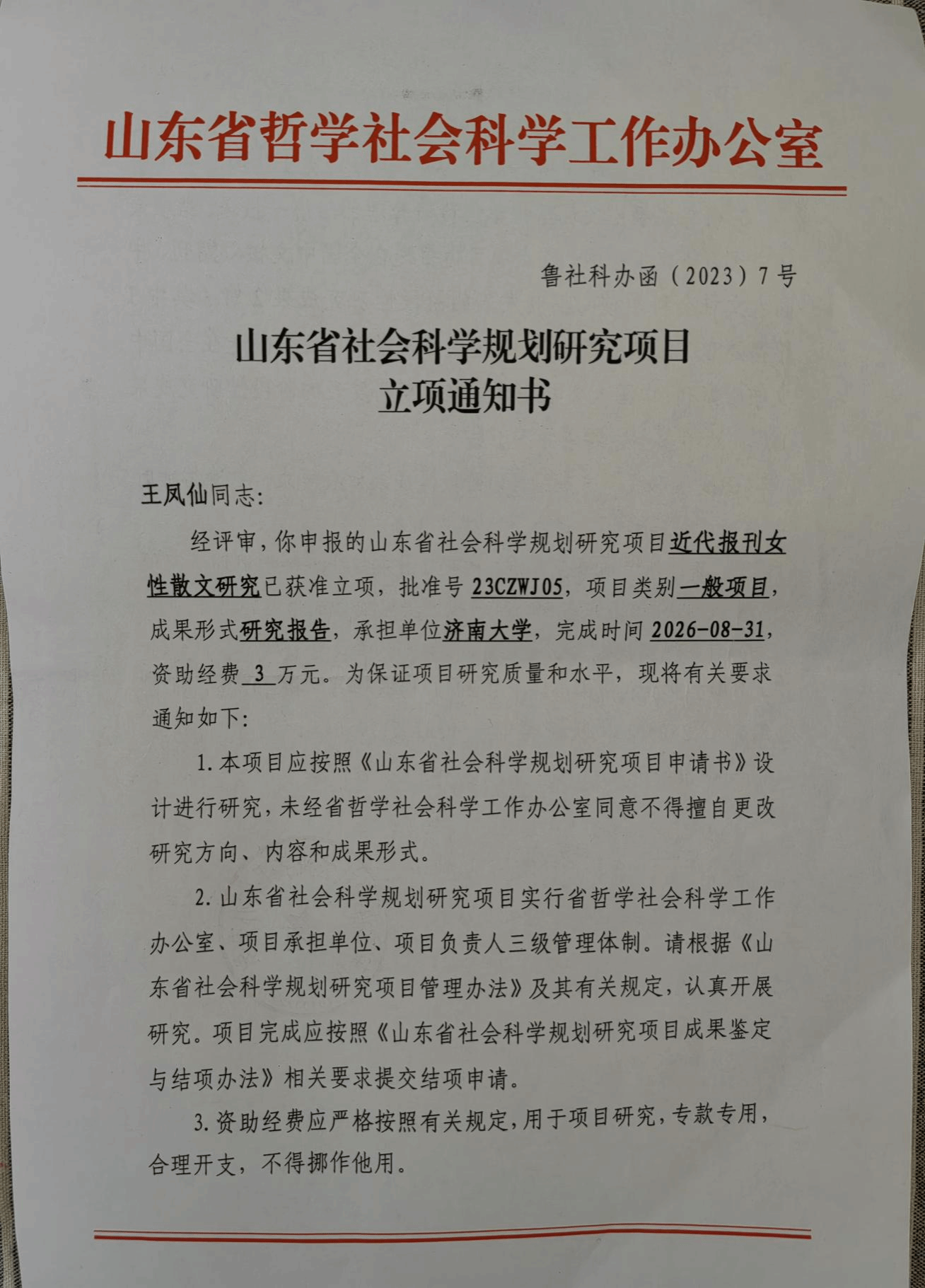 王凤仙山东省社科项目《近代报刊女性散文研究》《中国近代女性游记文献整理与研究》简介