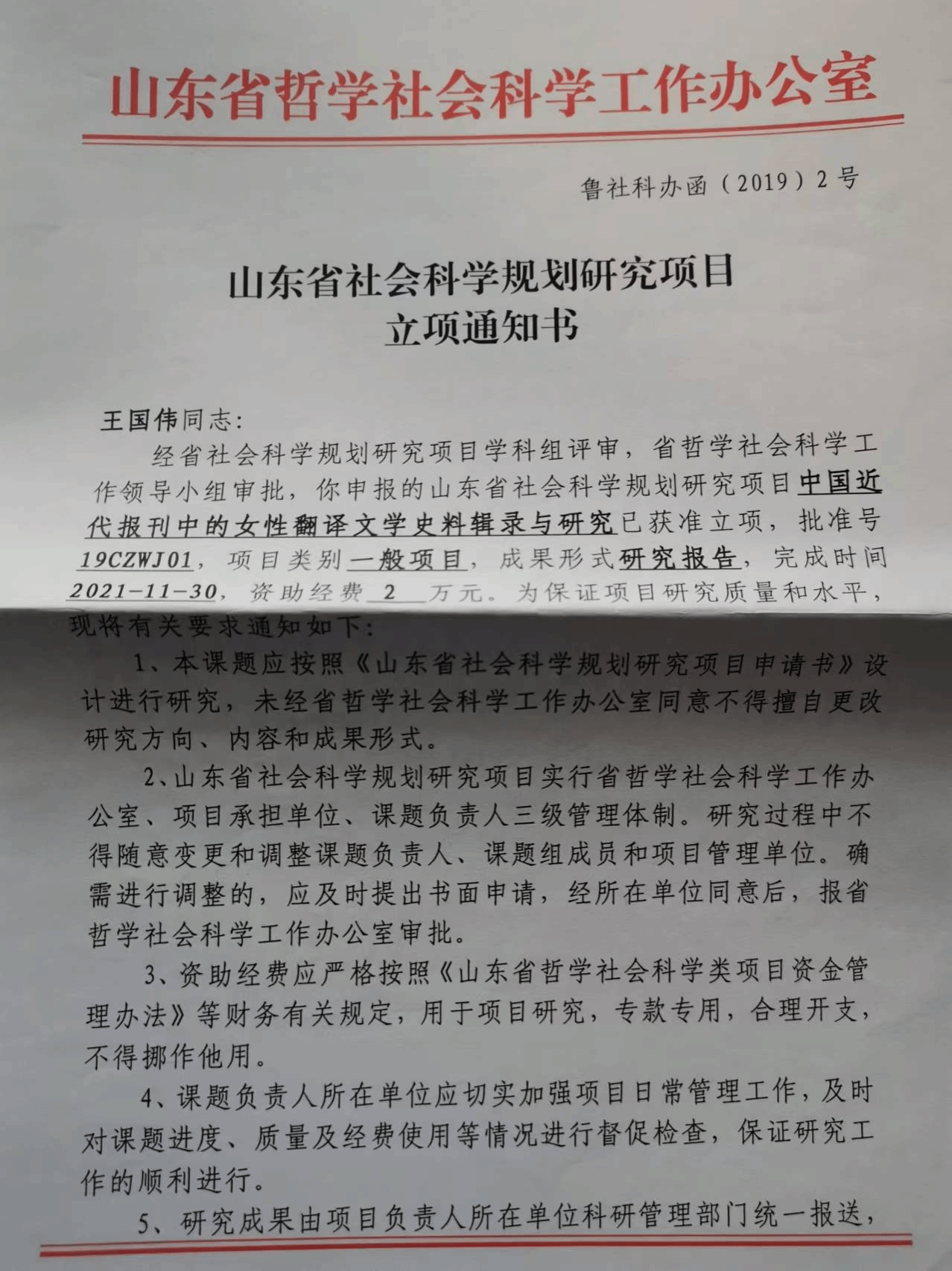王国伟主持的山东省社科规划研究项目“中国近代报刊中的女性翻译文学史料辑录与研究”(项目批准号为:19CZWJ01),主要内容包括: